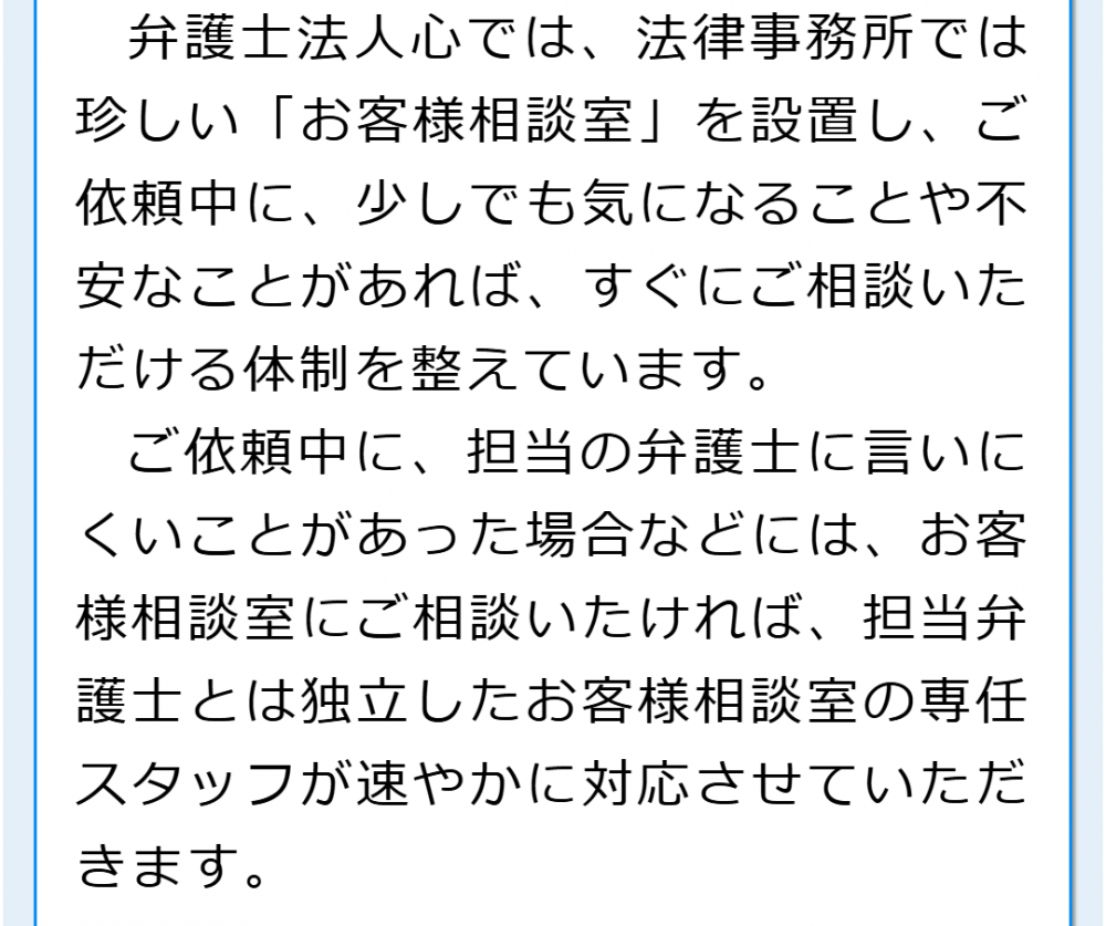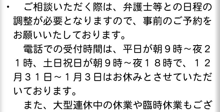 受付後、弁護士との相談日時が決まりましたら、該当の日時に弁護士とお話しいただけます。