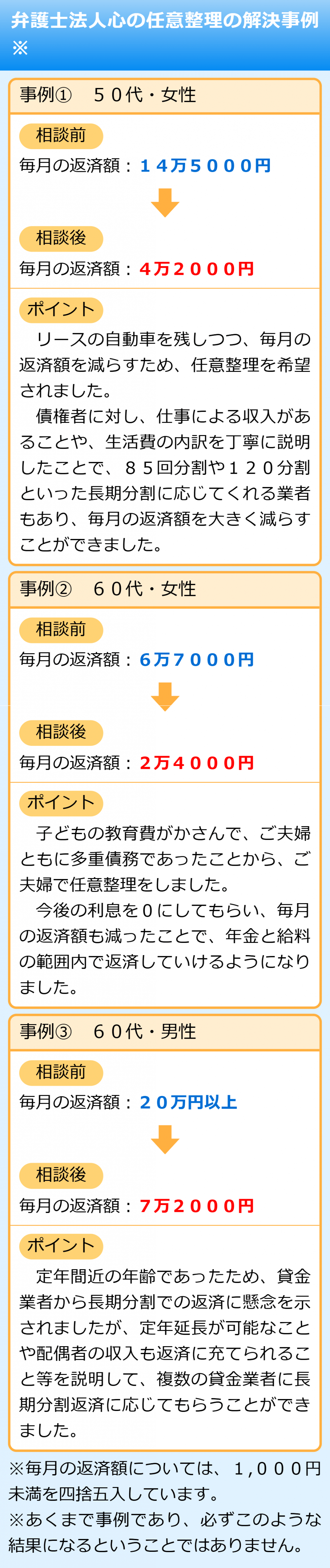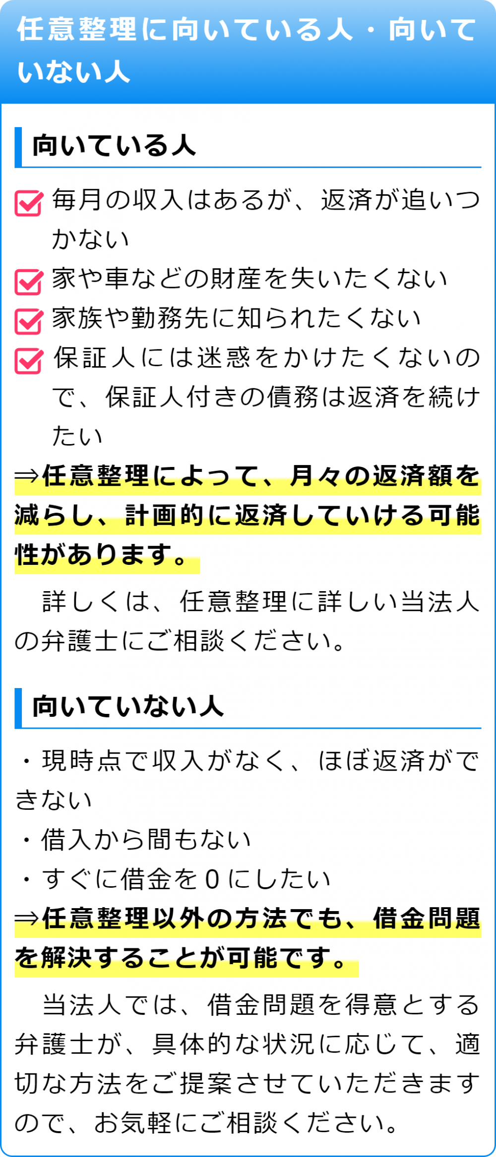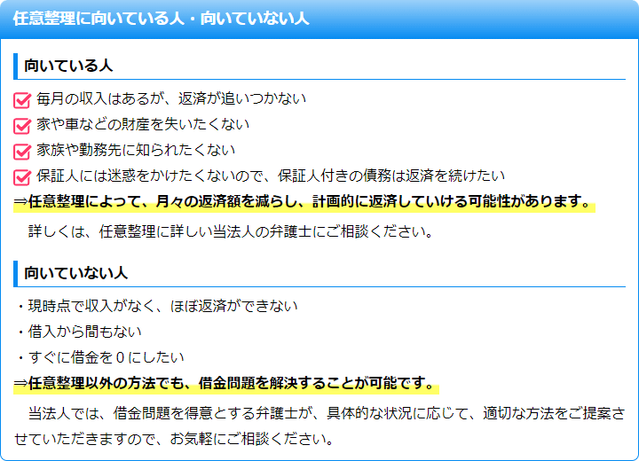 そのため、任意整理をご希望の際は借金の額が大きくなりすぎてしまう前に、当法人の弁護士にご相談いただくことをおすすめいたします。