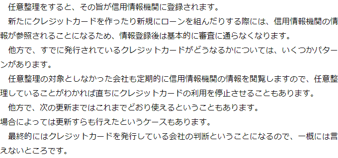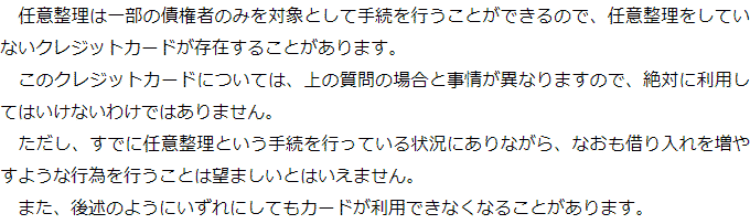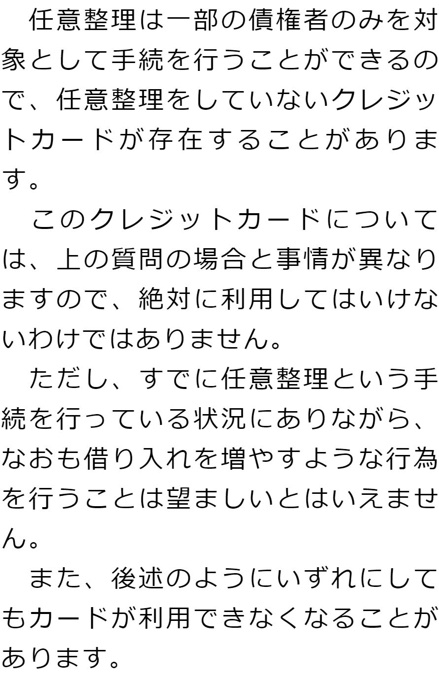 任意整理をした場合のクレジットカードに関するQ&AQ任意整理の対象としたクレジットカードは使えなくなるのですか?Q任意整理の対象としなかったクレジットカードであれば、使っても大丈夫ですか?Q任意整理の対象としなかったクレジットカードは使えなくなるのでしょうか? Q任意整理の対象としたクレジットカードは使えなくなるのですか?AQ任意整理の対象としなかったクレジットカードであれば、使っても大丈夫ですか?AQ任意整理の対象としなかったクレジットカードは使えなくなるのでしょうか?A お役立ち情報・Q&A(目次)お役立ち情報・Q&Aトップお役立ち情報任意整理が融資に与える影響について任意整理中に貸金業者等から郵送物が届くことはあるかQ&A任意整理をした場合のクレジットカードに関するQ&A 受付時間 平日 9時~21時、土日祝 9時~18時 夜間・土日祝の相談も対応します (要予約) 所在地 〒060-0808 北海道札幌市北区北八条西4‐1-1パストラルビルN8 2F 0120-41-2403 お問合せ・アクセス・地図